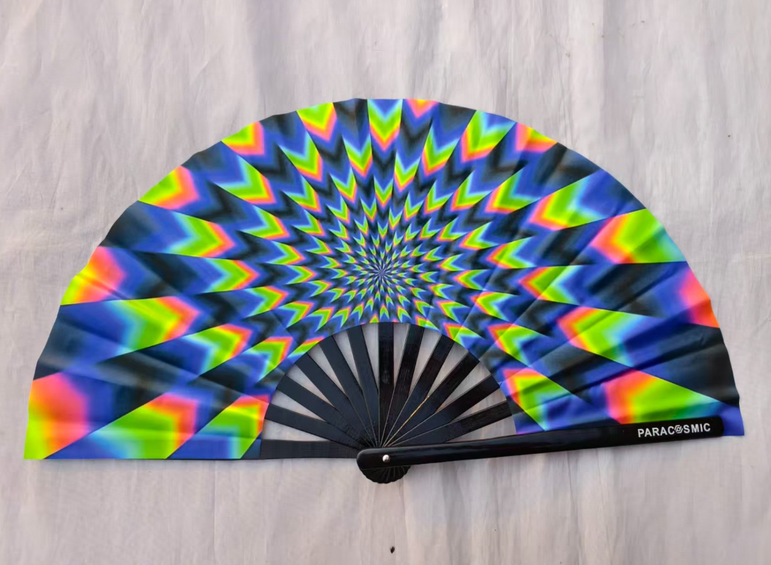 Whether you're deep in the rave, cooling off at a summer festival, or just adding a pop of color to your daily look, the "Vortex" is your ultimate statement piece. The sturdy black ribs provide a durable snap that sounds as loud as the design looks, while the smooth fabric ensures a powerful gust of air when the heat turns up.